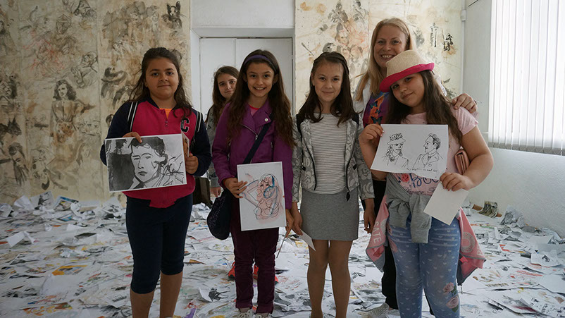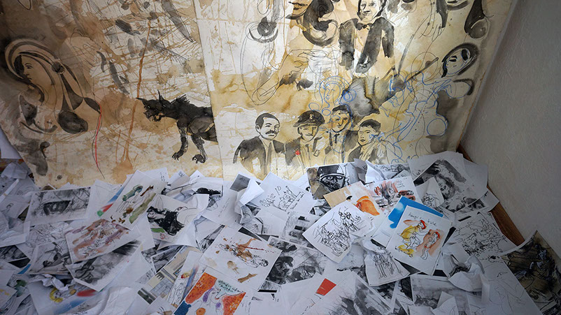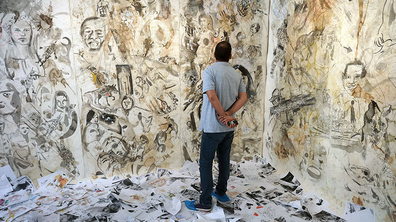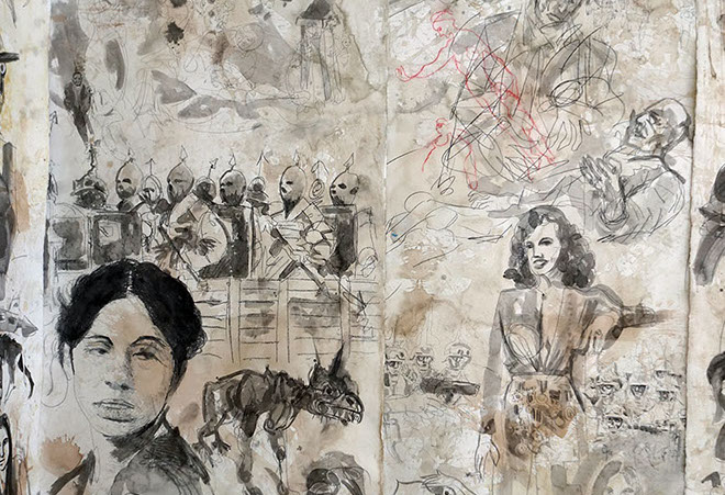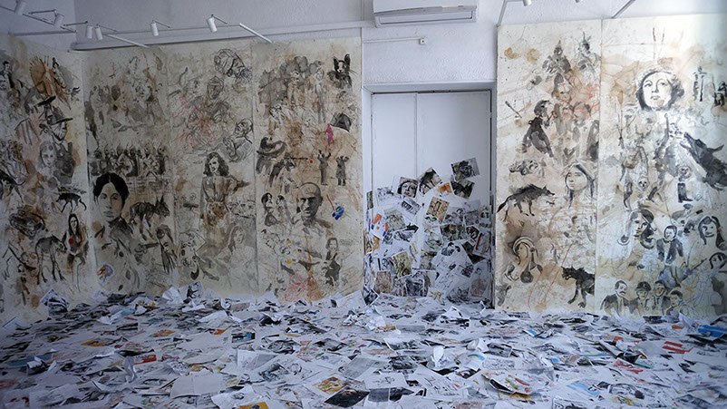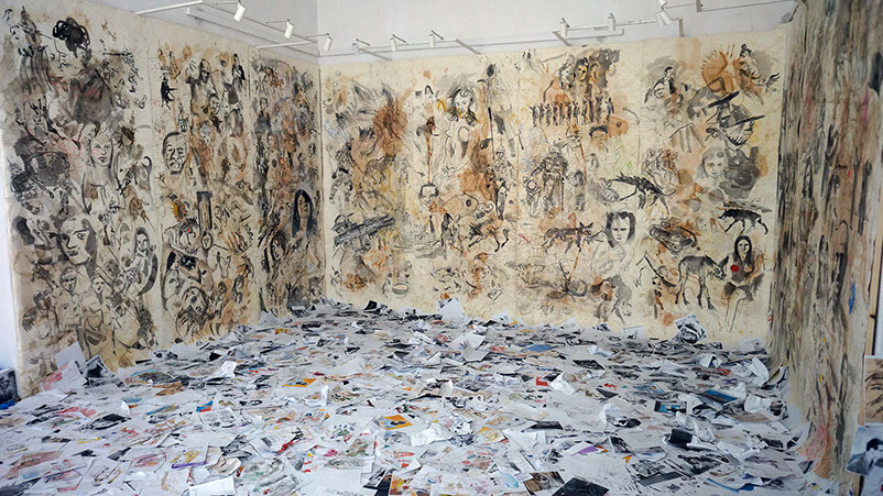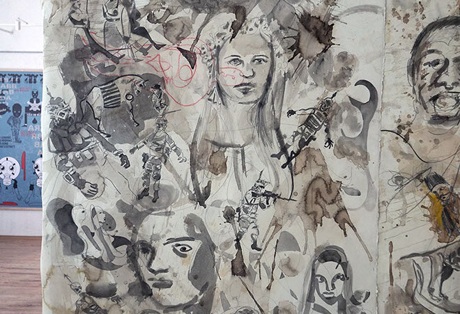 Die großformatigen Zeichnungen (ca. 60m2) sind an der Wand angebracht (tapeziert).