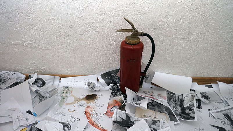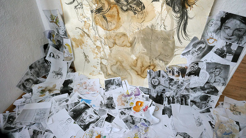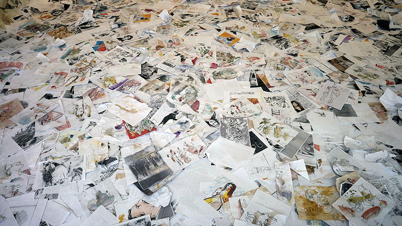 Die Rauminstallation besteht aus großformatigen Zeichnungen und ca. 10.000, teilweise kolorierten, Duplikaten. Die Zeichnungen sind an der Wand angebracht (tapeziert), die Duplikate liegen am Boden wie schwerelose Blätter im Herbst.