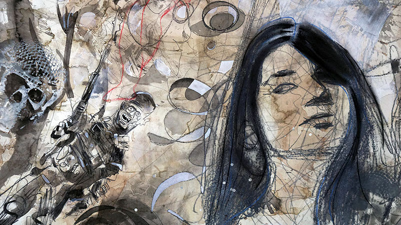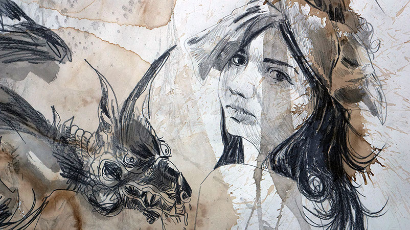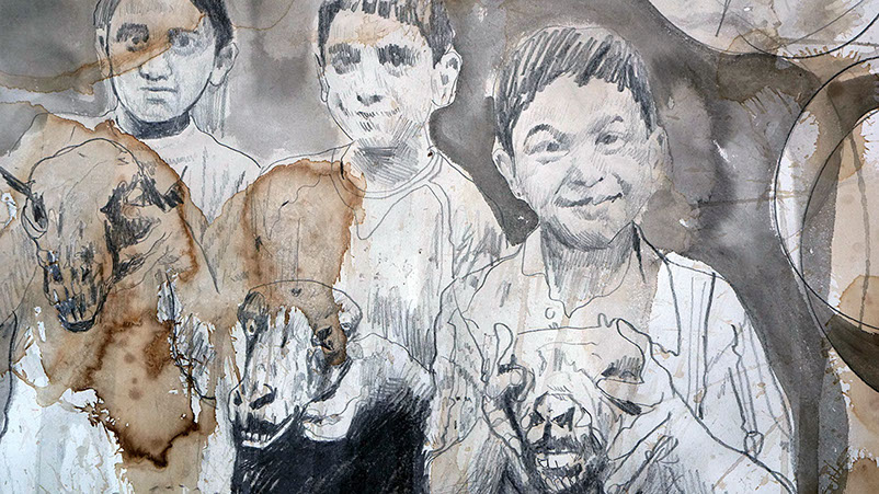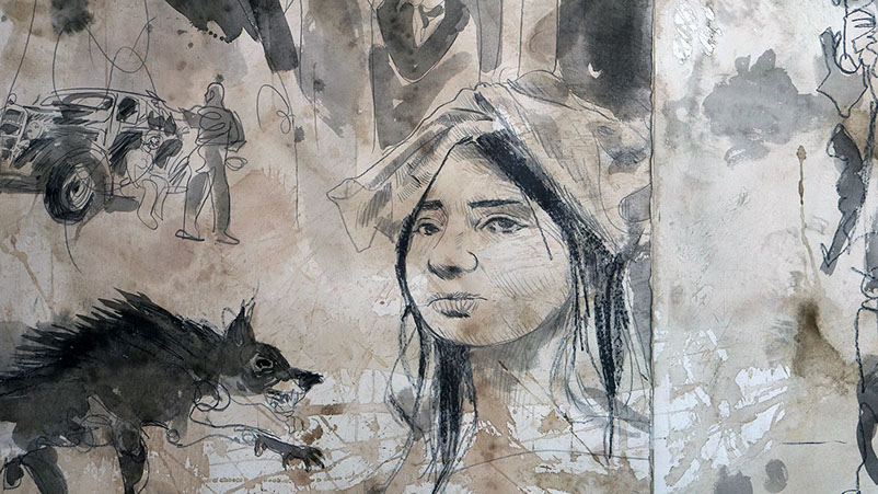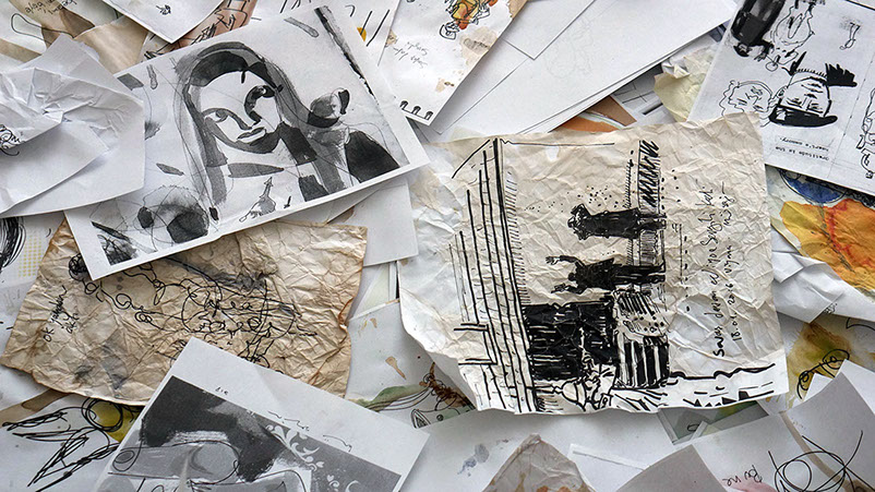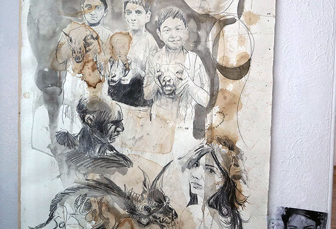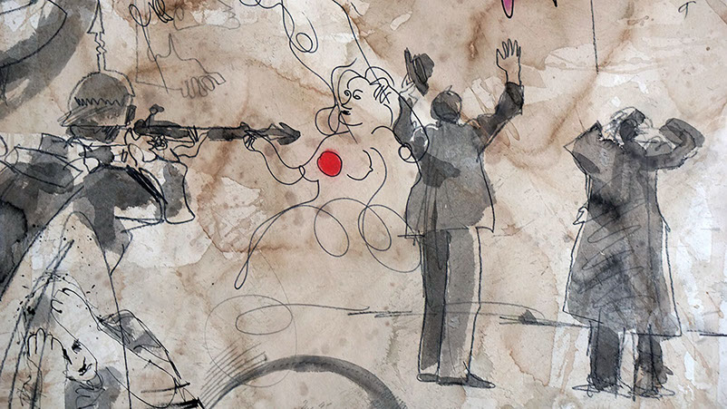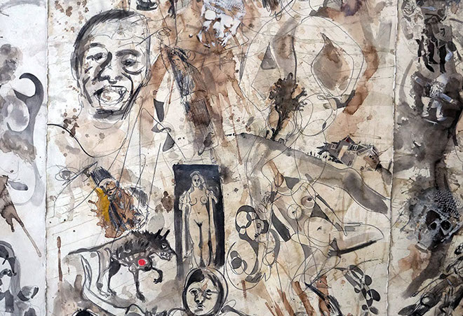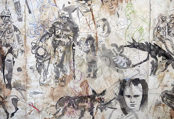 14-teilige Serie: großformatige Zeichnungen auf handgeschöpftem Kupferdruckpapier; gezeichnet mit Blei- und Grafitstift, Kohle, Farbkreide, schwarzer Tusche, Kaffee, Tee (Assam Gold und Darjeeling), Regenwasser und Schnee und ca. 10.000 Duplikaten, die teilweise koloriert sind. Thematischer Inhalt der Installation ist der heutige chaotische Zustand der Welt aus der Sicht einer Ratte, die in einem Sarg lebt und den Blick ihrer kreisenden Augen live an uns weiterleitet.Die Zeichnungen sind Liveaufnahmen Was sie sieht ist eine chaotische Welt – Krieg, Sex, Schmerz, Liebe und Tod, bellende Hunde aus früheren Jahrhunderten, ...